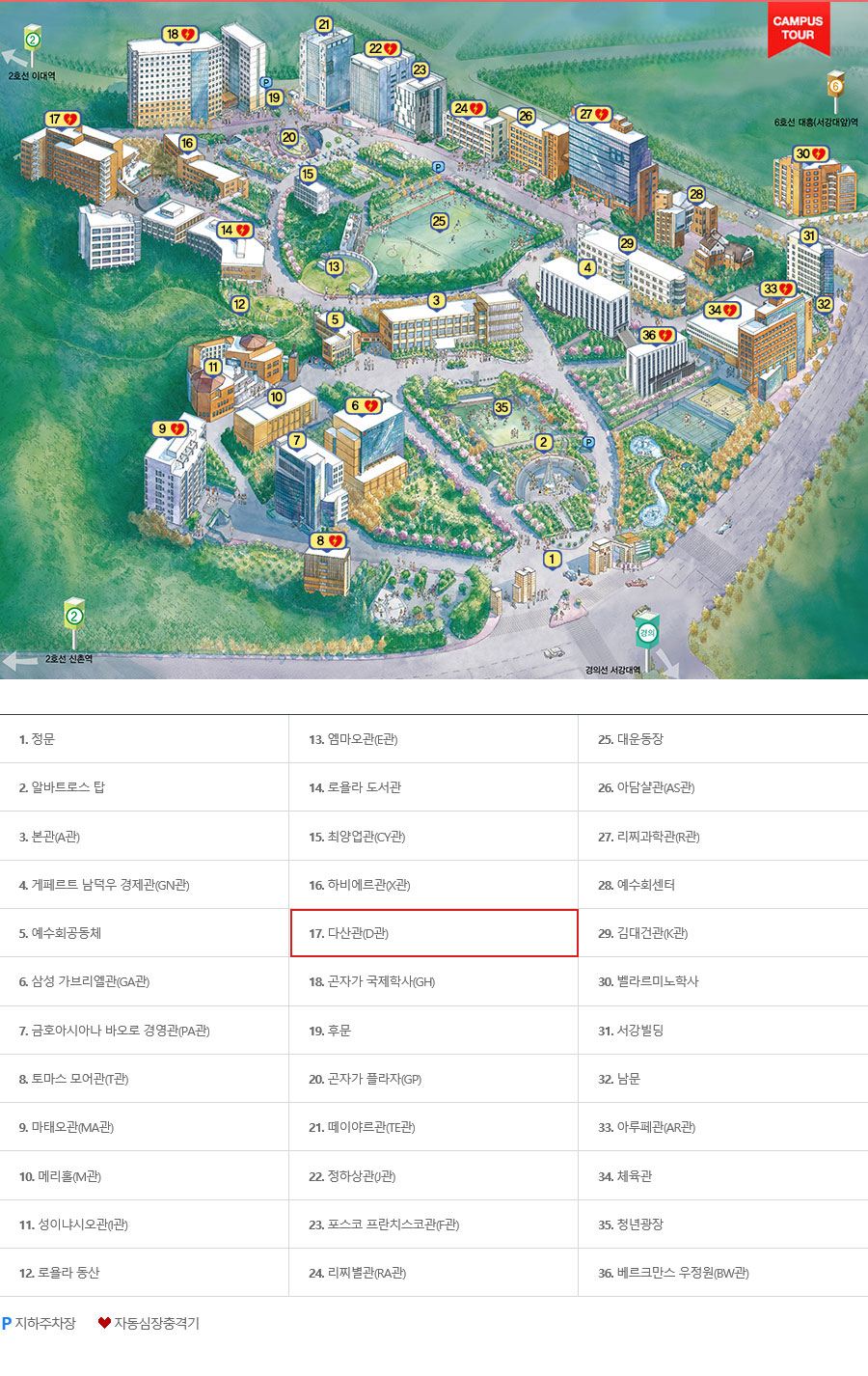 | 학교 찾아오는 방법 | 전철안내 : 2호선 신촌역 6번 출구에서 정문까지 도보 8분 / 6호선 대흥역 1번 출구에서 후문까지 도보 5분 / 경의선 서강대역 1번 출구에서 정문까지 도보 3분 버스안내 : 110, 170, 604, 730, 5711, 5714, 7016, 7613 |